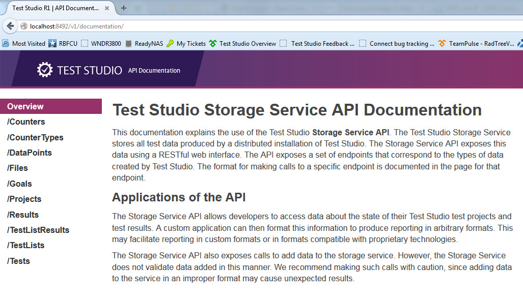 2) Navigate to the URL http://SchedulingServerAddress:8009/documentation. NOTE: Replace "SchedulingServerAddress" with the name of your remote machine that is running the Telerik Storage Service. This usually is the same machine that is also your Telerik Scheduling Server.