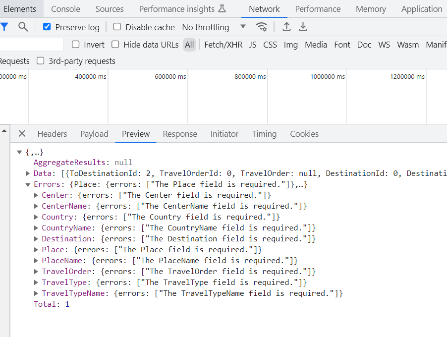 As a first step in the investigation I recommend you to try removing any [Required] DataAnnotations in the ToDestination class's properties.