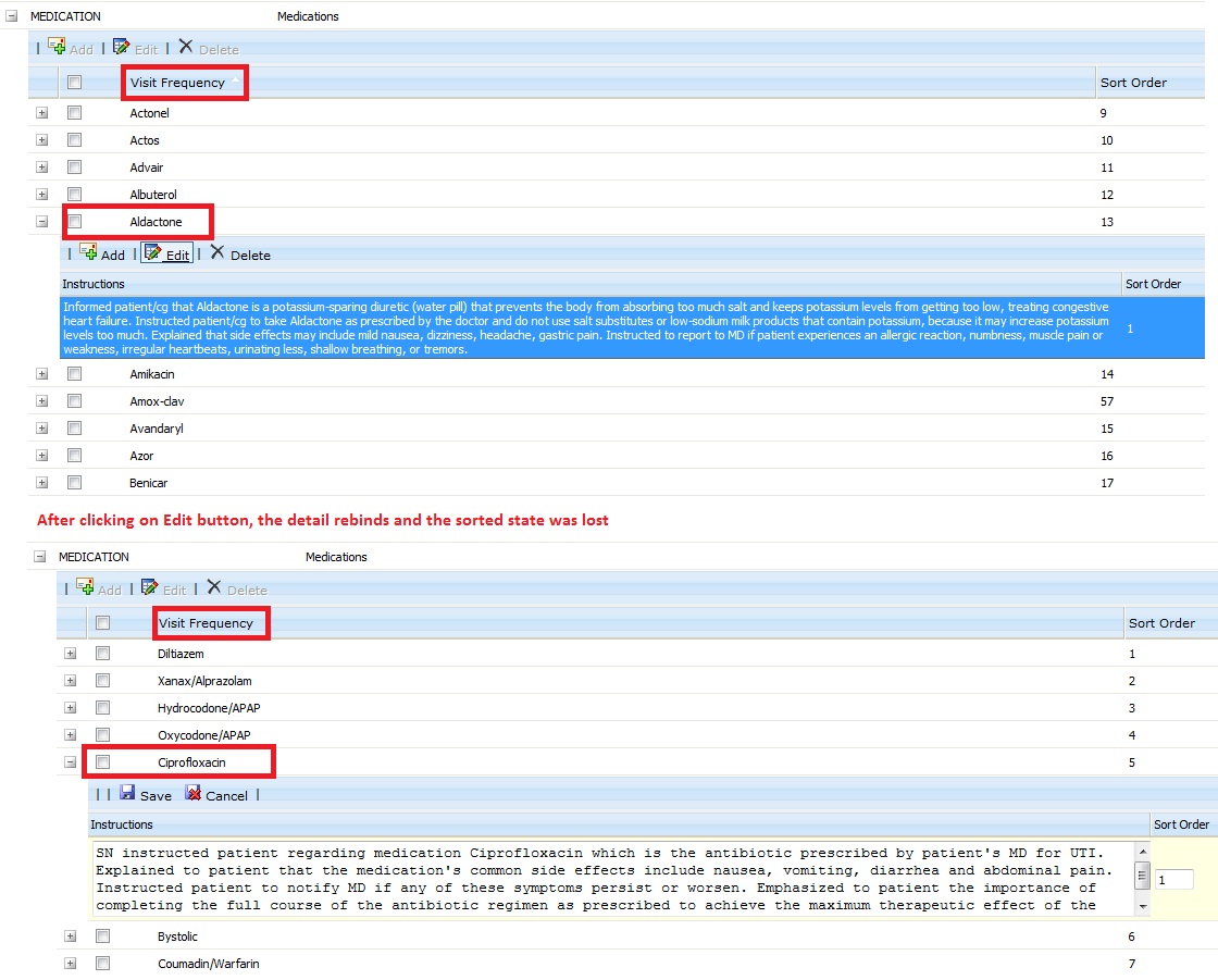 I have 2 detail tables and AllowSorting is set to true and EditMode = Inplace. When I sort the detail table and edited one row, the detail table rebinds again and the row that I was trying to edit was not the original one.
