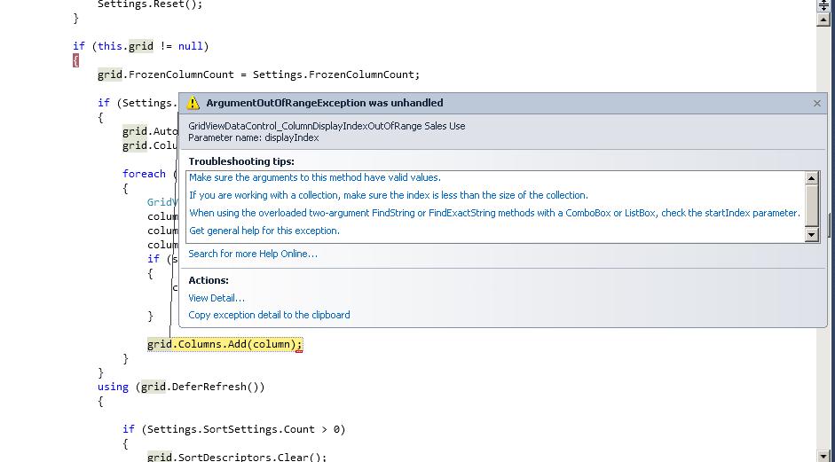 if (this.grid != null) { grid.FrozenColumnCount = Settings.FrozenColumnCount; if (Settings.ColumnSettings.Count > 0) { foreach (ColumnSetting setting in Settings.ColumnSettings) { ColumnSetting currentSetting = setting; GridViewDataColumn column = (from c in grid.Columns.OfType<GridViewDataColumn>() where c.UniqueName == currentSetting.UniqueName select c).FirstOrDefault(); if (column != null) { if (currentSetting.DisplayIndex != null) { column.DisplayIndex = currentSetting.DisplayIndex.Value; } if (setting.Width != null) { column.Width = new GridViewLength(setting.Width.Value); } } } }This code is created against our current official release Q3 2010 SP1. What version of RadControls are you using ?