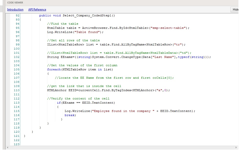 HtmlTable table = Manager.ActiveBrowser.Find.ByAttributes<HtmlTable>("id=myTable");HtmlAnchor googleLink = table.Find.ByContent<HtmlAnchor>("Google");googleLink.Click();HtmlTable table = Manager.ActiveBrowser.Find.ByAttributes<HtmlTable>("id=myTable");HtmlAnchor googleLink = table.Find.ByExpression<HtmlAnchor>("textcontent=Google");googleLink.Click();Here is another video which demonstrates it.
