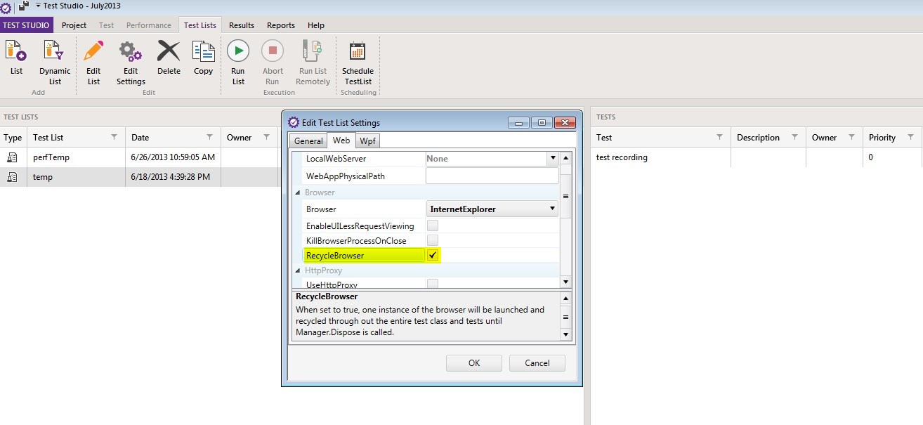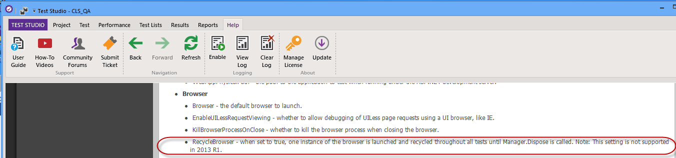 RecycleBrowser - when set to true, one instance of the browser is launched and recycled throughout all tests until Manager.Dispose is called. Note: This setting is not supported in 2013 R1.