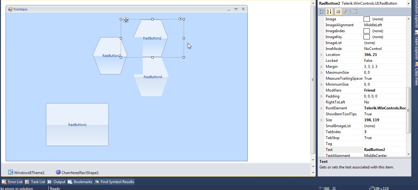 If you are not able to see the Shape property could you confirm that you are using RadButton, not the standard MS Button? The standard MS Button does not have Shape property. I attached a project where a RadButton with a custom shape is added. Could you please give it a try and let me know hot it works for you?