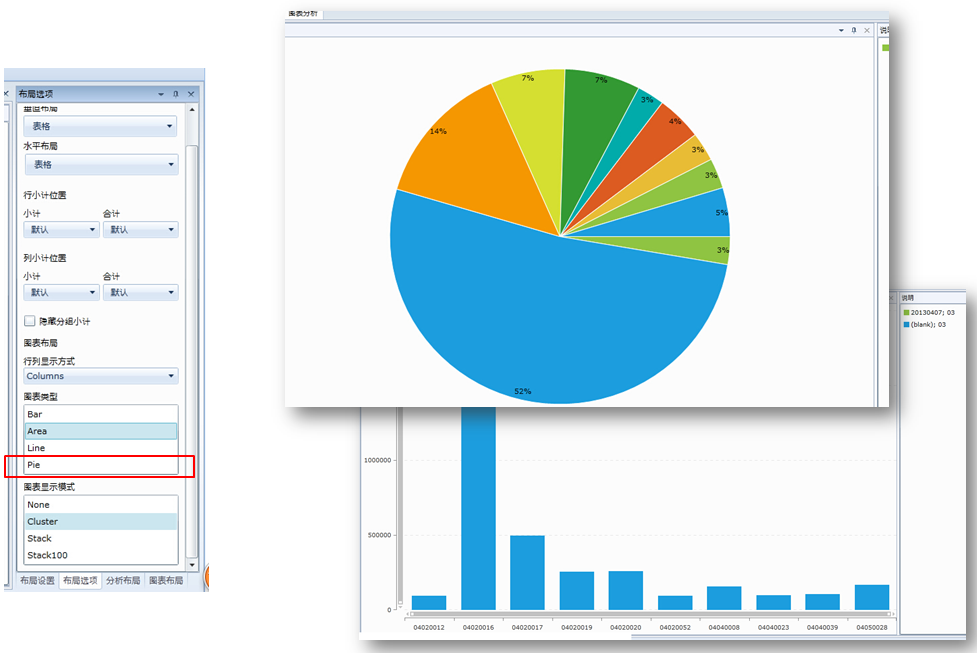 This example demonstrates, integration between RadPivotGrid and RadCartesianChart and it uses the Cartesian chart's SeriesDescriptor to generate dynamic number of series and easily change between the series types. However, the pie chart is not part of the RadCartesianChart control and in order to change the chart's visualization you will need to use different control (The RadPieChart).