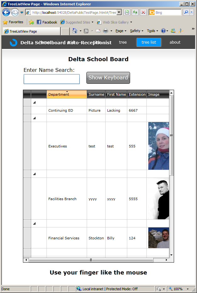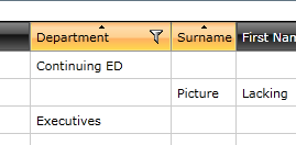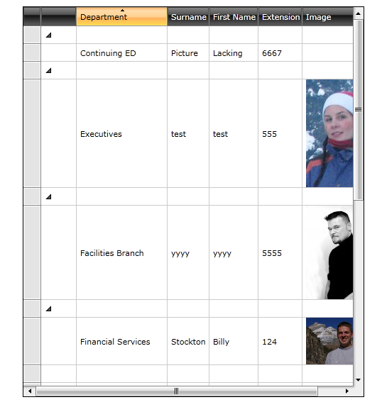 <telerik:RadTreeListView x:Name="MyTreeListView" Grid.Row="2" Grid.ColumnSpan="2" Margin="8" AutoGenerateColumns="False" BorderBrush="Black" IsReadOnly="True" SelectionMode="Single" CanUserFreezeColumns="False" CanUserReorderColumns="False" CanUserResizeColumns="False" CanUserSortColumns="False" ShowGroupPanel="True" HierarchyColumnIndex="0" ItemsSource="{Binding DataView, ElementName=SBDomainDataSource}" SelectionChanged="MyTreeView_SelectionChanged" > <telerik:RadTreeListView.ItemTemplate> <DataTemplate> <TextBlock Text="{Binding Path=DepartmentName}" Width="150" /> </DataTemplate> </telerik:RadTreeListView.ItemTemplate> <telerik:RadTreeListView.SortDescriptors> <telerik:SortDescriptor Member="DepartmentName" SortDirection="Ascending"></telerik:SortDescriptor> </telerik:RadTreeListView.SortDescriptors> <telerik:RadTreeListView.ChildTableDefinitions> <telerik:TreeListViewTableDefinition ItemsSource="{Binding People}" /> </telerik:RadTreeListView.ChildTableDefinitions> <telerik:RadTreeListView.Columns> <telerik:GridViewColumn Width="50" /> <telerik:GridViewDataColumn x:Name="departmentColumn" Header="Department" UniqueName="ColDept" DataMemberBinding="{Binding Path=Department.DepartmentName, Mode=TwoWay}" IsReadOnly="True" ShowFieldFilters="False" /> <telerik:GridViewDataColumn x:Name="surnameColumn" Header="Surname" UniqueName="ColLastName" DataMemberBinding="{Binding Path=LastName, Mode=TwoWay}" TextWrapping="Wrap" IsReadOnly="True" ShowFieldFilters="False" SortingState="Ascending" > </telerik:GridViewDataColumn> <telerik:GridViewDataColumn x:Name="firstnameColumn" Header="First Name" UniqueName="ColFirstName" DataMemberBinding="{Binding Path=FirstName, Mode=TwoWay}" TextWrapping="Wrap" IsReadOnly="True" /> <telerik:GridViewDataColumn x:Name="extColumn" Header="Extension" DataMemberBinding="{Binding Path=Extension}" TextWrapping="Wrap" IsReadOnly="True" /> <telerik:GridViewImageColumn x:Name="thumb" Header="Image" DataMemberBinding="{Binding Path=imageData, Mode=TwoWay }" ImageWidth="100" IsReadOnly="True" /> </telerik:RadTreeListView.Columns> </telerik:RadTreeListView>The data source is a master-detail of Department (Department_uid, DepartmentName, People) where People is an EntityCollection<Person>. All I want is ti have the DepartmentName field displayed beside the Expander.