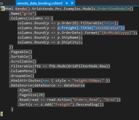 @model List<StockBetaVolatility><br>@(Html.KendoGrid<StockBetaVolatility>()<br> .Name("MainGridTable")<br> .EnableCustomBinding(true)<br> .Columns(columns =><br> {<br> columns.Bound(p => p.TradeDate).Width(100);<br><br> columns.ForeignKey(p => p.StockID, Shared.StockBaseNameList());<br> columns.Bound(p => p.StockBeta).Title("stockβvalue");<br> columns.Bound(p => p.StockVolatility);<br><br> })<br> .DataSource(dataSource => dataSource<br> .Ajax()<br> .Read(r => r.Action("AjaxRead", ViewContext.ControllerName())<br> .Data("PanelBarParameters"))<br> .ServerOperation(true)<br><br> )<br> .DefaultFormat()<br> .Events(events => events.Change("GridMainSelect"))<br>)Maybe telerik version is problem point?