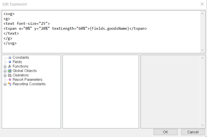 </svg>'The expression will be evaluated and the value of the goodsName field in the current data row will be used to populate the text of the SVG's <tspan> element.
