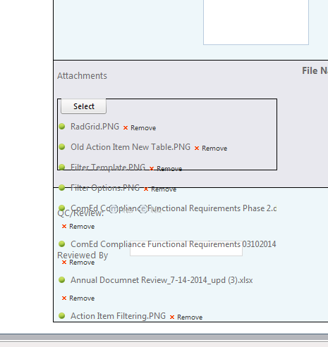 <telerik:RadAsyncUpload ID="RadAsyncUpload1" runat="server" Height="100%" MultipleFileSelection="Automatic" MaxFileInputsCount="15" Width="100%" Skin="Default" UploadedFilesRendering="BelowFileInput" AllowedFileExtensions="doc,docx,pdf,png,xls,xlsx" HideFileInput="true" InputSize="15"></telerik:RadAsyncUpload>Any suggestions on how to alter the file list with css or any other means will be greatly appreciated.