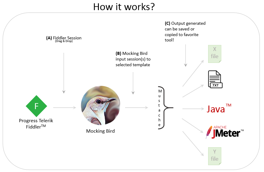 short description: There are lots of reason you might need to debug a HTTP/HTTPs request(s), be it try to recreate a issue and narrow-down the problem in your favorite language editor or compare contents between different request(s) etc. MockingBird is a Progress Telerik FiddlerTM extension to transform a Fiddler's HTTP/HTTPs session to any other format you want e.g. you can generate Java, C#.net or any other language code from selected requests you want to troubleshoot issues for and use the output code in your favourite IDE. It's not limited to just code and can be used to create any format as long as you can create a Mustache template for it e.g. you can create a csv file with selected HTTP request to perform a functional or load test in SOAP UI or JMeter.