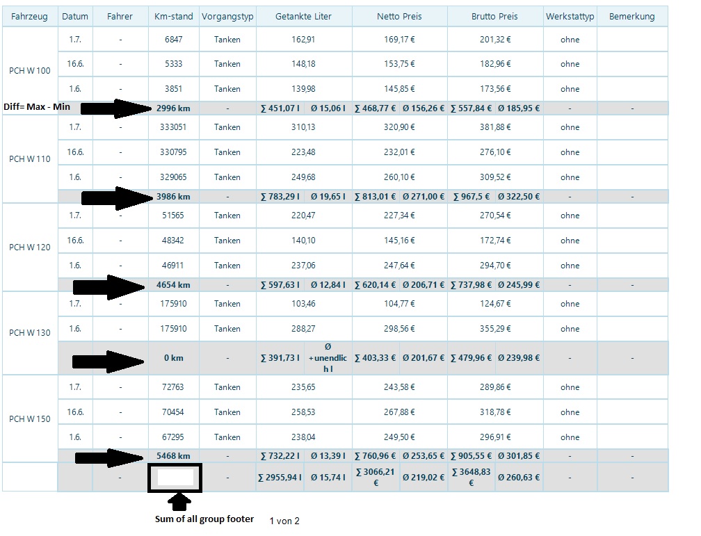In my case, how I try to demonstrate in the above screenshot Vehicle-Report.jpg, I want to sum up all the values in the groupfooter lines.