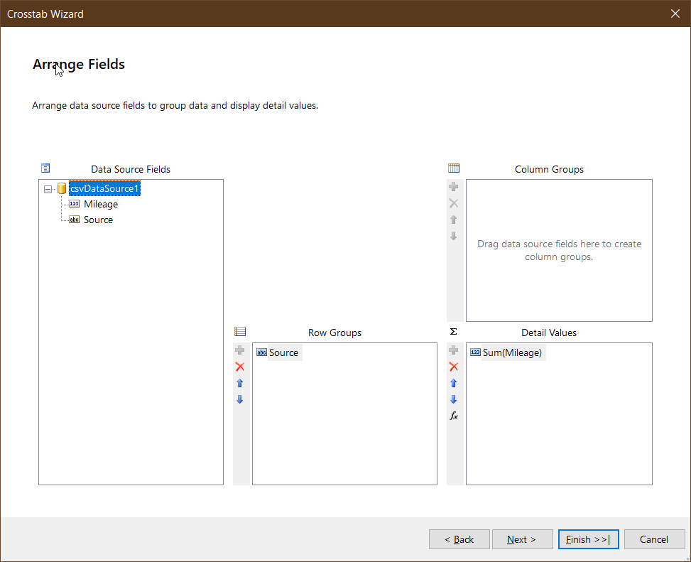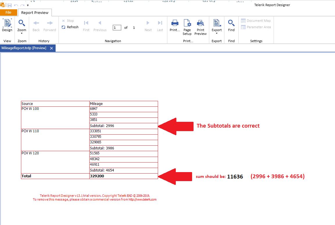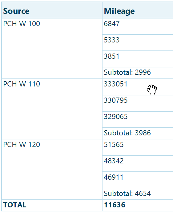 =CalcDifference(Fields.Source, Fields.Mileage, 'TOTAL')Report Preview: