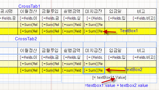 Basically, the first thread explains what is the correct way to achieve your goal and the second offers a workaround, which is not very reliable. Personally, I'd go with the approach in the first thread and maybe create a data source, from which I can sum the totals, which are displayed in the two text boxes. Since their values probably also come from data sources, it should be possible to combine those data sources into a single one and use it for calculating the grand total.