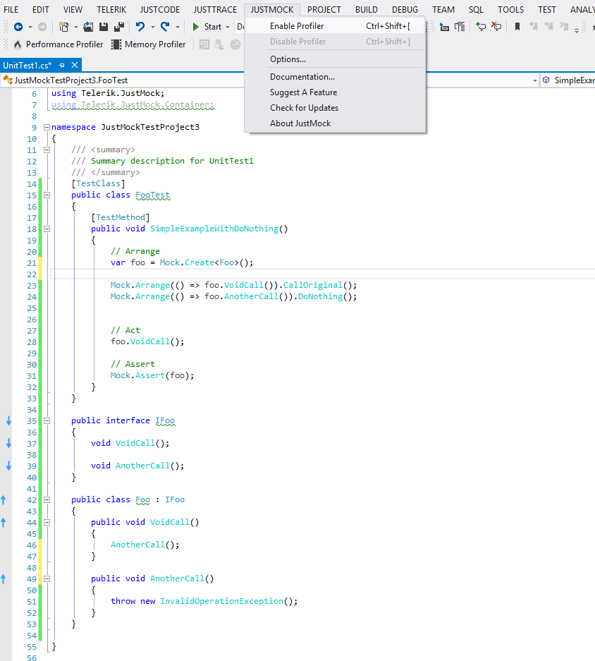 [TestClass] public class FooTest { [TestMethod] public void SimpleExampleWithDoNothing() { // Arrange var foo = Mock.Create<Foo>(); Mock.Arrange(() => foo.VoidCall()).CallOriginal(); Mock.Arrange(() => foo.AnotherCall()).DoNothing(); // Act foo.VoidCall(); // Assert Mock.Assert(foo); } } public interface IFoo { void VoidCall(); void AnotherCall(); } public class Foo : IFoo { public void VoidCall() { AnotherCall(); } public void AnotherCall() { throw new InvalidOperationException(); } }