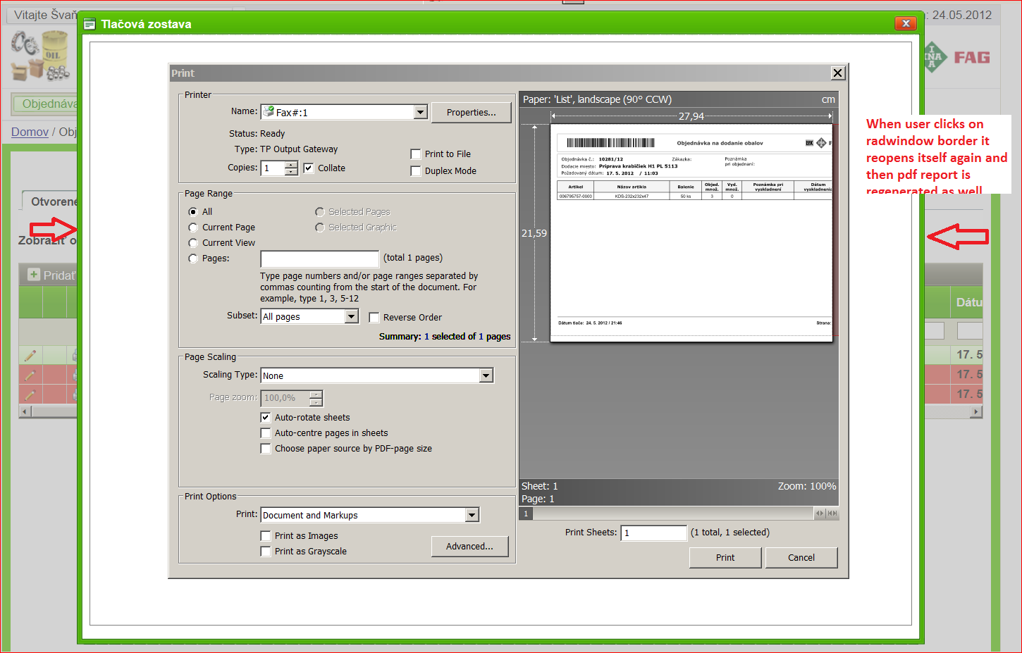 <%@ Page Language="C#" AutoEventWireup="true" CodeFile="Report_skladove_polozky_z_objednavky.aspx.cs" Inherits="_Default" Async="false" %><%@ Register TagPrefix="telerik" Namespace="Telerik.Web.UI" Assembly="Telerik.Web.UI" %><%@ Register Assembly="Telerik.ReportViewer.WebForms" Namespace="Telerik.ReportViewer.WebForms" TagPrefix="telerik" %><!DOCTYPE html PUBLIC "-//W3C//DTD XHTML 1.1//EN" "http://www.w3.org/TR/xhtml11/DTD/xhtml11.dtd"><html xmlns="http://www.w3.org/1999/xhtml"><head id="Head1" runat="server"> <%--<link href="~/Scripts/CSS/EditFormStyles.css" rel="stylesheet" type="text/css" />--%> <title>Tlačová zostava</title> <style type="text/css"> #AllPanel { width:100%; height:100%; margin:0px; padding:0px; font-family: Arial, Helvetica; font-size: 14px; } #AllPanel a { color: black; text-decoration: none; } </style> <script language="JavaScript" type="text/javascript"> function GetRadWindow() { var oWindow = null; if (window.radWindow) oWindow = window.radWindow; else if (window.frameElement.radWindow) oWindow = window.frameElement.radWindow; return oWindow; } function content_onkeydown(e) { //alert("clicked in content page content"); try { if (!e) e = window.event; if (e.keyCode == 27) { FocusOnRadWindow(); var oWindow = GetRadWindow(); //Obtaining a reference to the current window oWindow.Close(); } } catch (err) { } } function FocusOnRadWindow() { GetRadWindow().GetContentFrame().contentWindow.focus(); } function secondFn() { window.setTimeout(function () { var senderElementStyle = GetRadWindow().get_popupElement().style; //alert(senderElementStyle.width + " " + senderElementStyle.height); document.getElementById("pdfObject").style.height = parseInt(senderElementStyle.height) - 63 + "px"; }, 0) window.setTimeout(function () { GetRadWindow().GetContentFrame().contentWindow.focus(); }, 1000) } document.onkeydown = content_onkeydown;</script></head><body"> <form id="form1" runat="server"> <asp:ScriptManager ID="ScriptManager2" runat="server"> </asp:ScriptManager> <telerik:RadSkinManager ID="RadSkinManager2" runat="server" ShowChooser="false" Skin="Hay"> </telerik:RadSkinManager> <object><embed width="100%" type="application/pdf" id="pdfObject" runat="Server"></embed></object> </form></body></html>Thank you for your ideas.