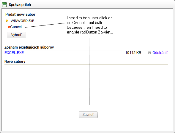 I have one issue with radasyncupload control. I need to trap event when user clicks on cancel button during uploading of a file. I didn't find any onclient method which could allow this.
