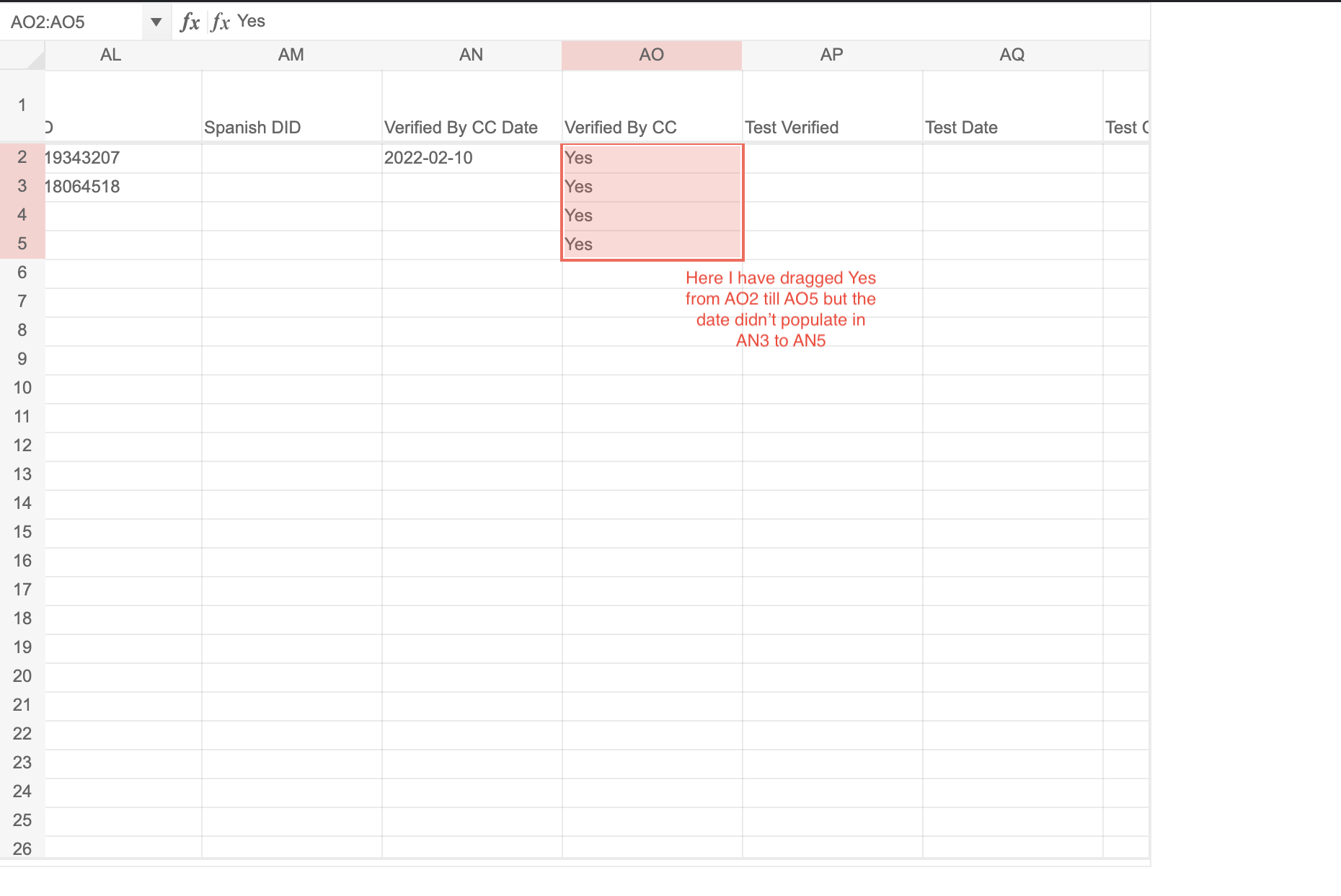 This is working fine if I update each cell individually, i.e AO2, AO3, AO4 one by one. But if I do the drag value, this doesn't work.