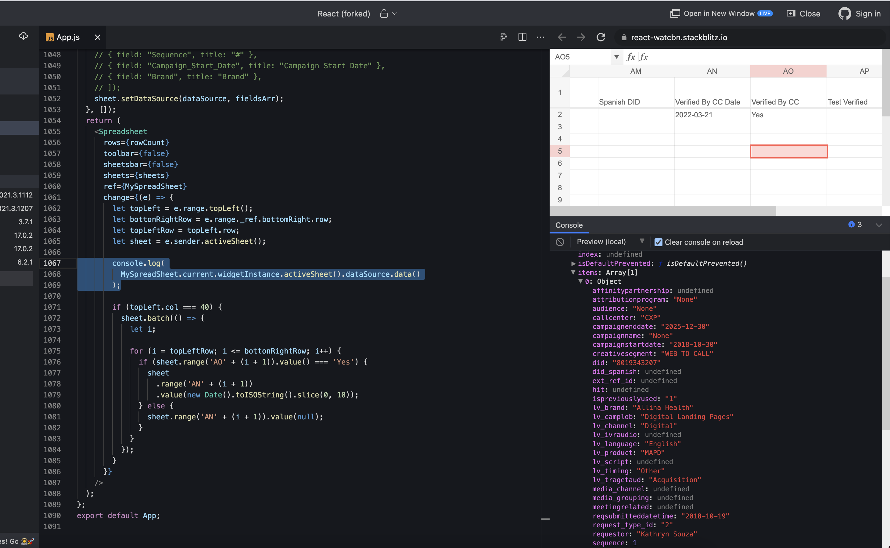 console.log( MySpreadSheet.current.widgetInstance.activeSheet().dataSource.data() );So in short, I'm only consoling the output of current data in the spreadsheet. If I update the AO field(Verified by cc) to Yes, it updates the AN field(Verified By CC Date) to the current date. Now when I'm again updating any other field of that row, it shows AN field is undefined (i.e in the next console.log cycle).