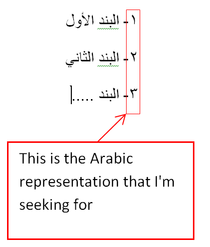 My question is: how to use such function to replace English numbers coming up from numbered lists, with their Arabic representation? I tried using ListLevelStyle but I could not find where lies the up coming numbers of the list.