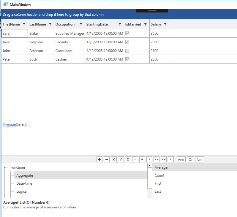 Average(Ratings) >= 3If you wish to display the average value of the Salary property of the items in RadGridView's ItemsSource, you can define an aggregate function for the Salary column.