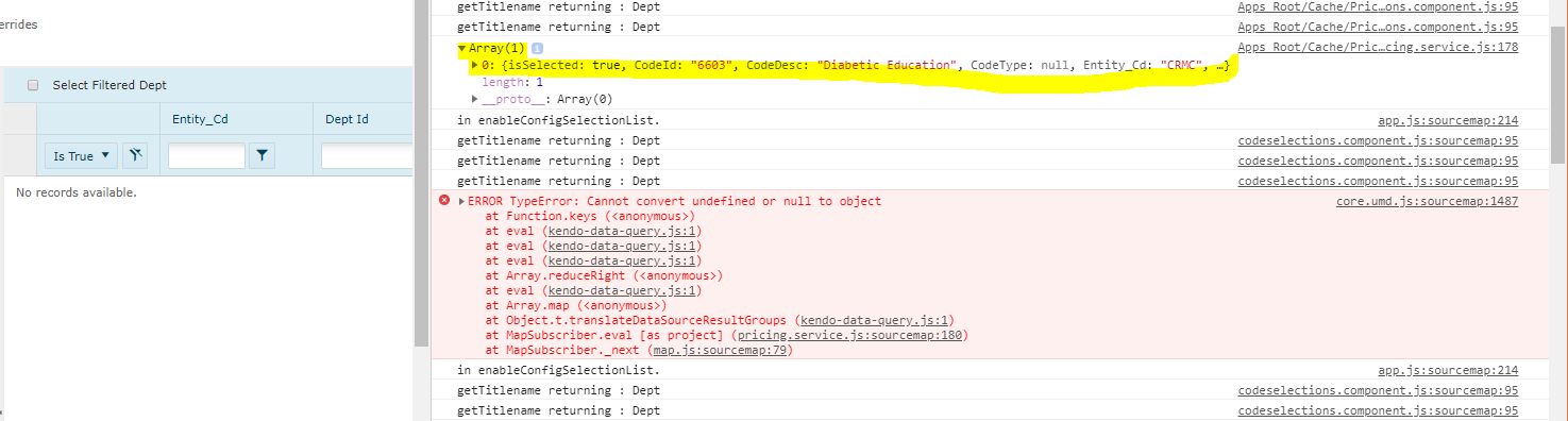Now, I need to work on another grid which has a group defined, and I keep getting the error of 'Cannot convert undefined or null' at the line where translateDataSourceResultGroups is called.