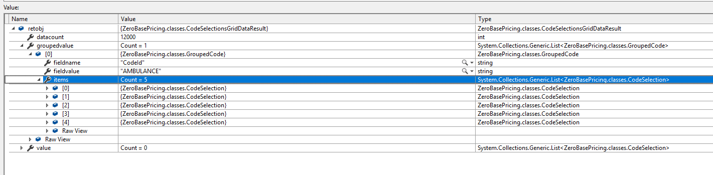 public class CodeSelectionsGridDataResult { public int datacount { get; set; } public List<CodeSelection> value { get; set; } public List<GroupedCode> groupedvalue { get; set; } }public class GroupedCode { public string fieldname { get; set; } public string fieldvalue { get; set; } public List<CodeSelection> items { get; set; } }public class CodeSelection { public bool isSelected { get; set; } public string CodeId { get; set; } public string CodeDesc { get; set; } public string CodeType { get; set; } public string Entity_Cd { get; set; } public string CurrentOverrideDesc { get; set; } public string CurrentOverrideCombo { get; set; } public CodeSelection() { } }8. Attached are screenshots of data returned by the service on server side.