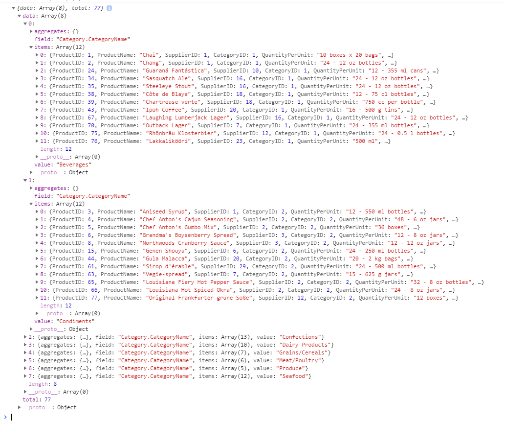 Would you have a sample of the grouped data structure that is returned by the server, so I can build a similar structure. For example, with group criteria: [{ field: 'UnitPrice'}], what would the data structure be like?
