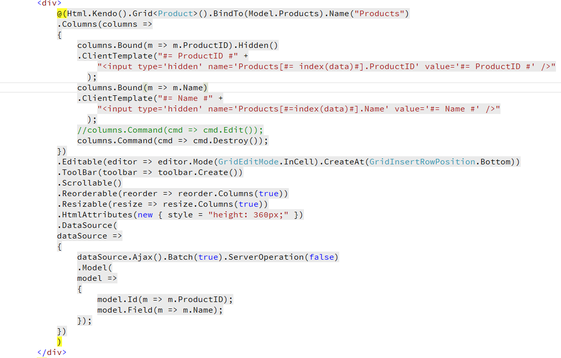 "<input type='hidden' name='Products[#=index(data)#].Name' value='#= Name #' />"