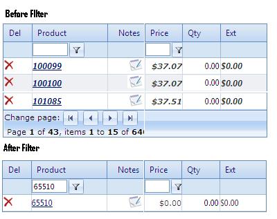 I am using RadGrid and using Filter By Column functionality. My grid displays Products and Details (including pricing) after loading the Order Guide. Pricing calculation takes time so we calculate price while change the page (of RadGrid). After loading Order Guide if I want to see particular product by filter then grid shows the row but not the pricing of the item because after filter there have no code written to calculate price for filtered Row. How can I work with the Filtered Row (at which event I can get the filtered row before it displays or get loaded)? (Please refer the attached snapshot)