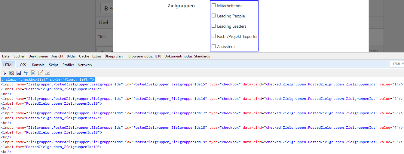 @Html.CheckBoxListFor(model => model.PostedZielgruppen.ZielgruppenIds, model => model.AvailableZielgruppen, entity => entity.Id, entity => entity.Name, model => model.SelectedZielgruppen, htmlListInfo, entity => new { data_skip = "true" })I hope this information will help.