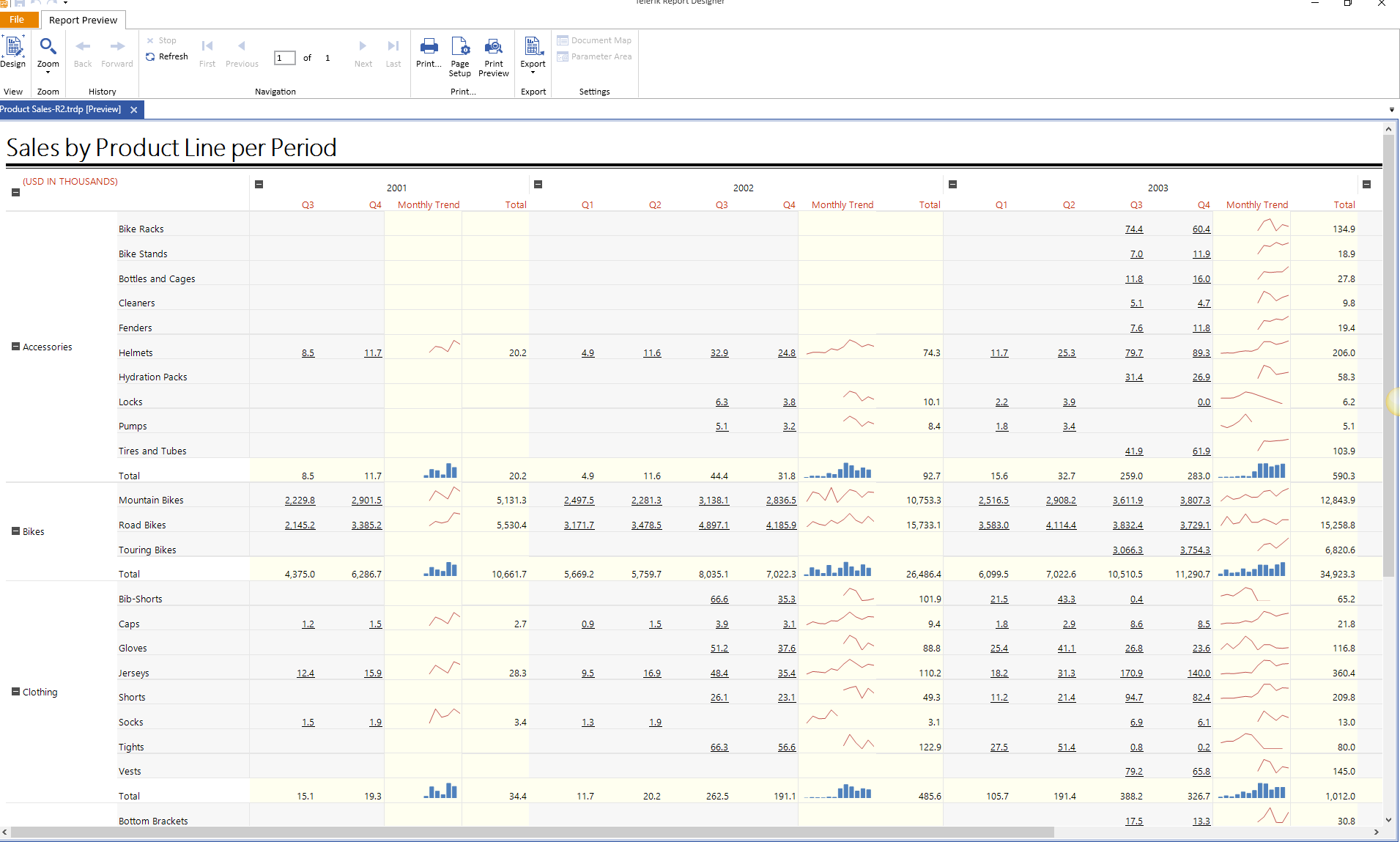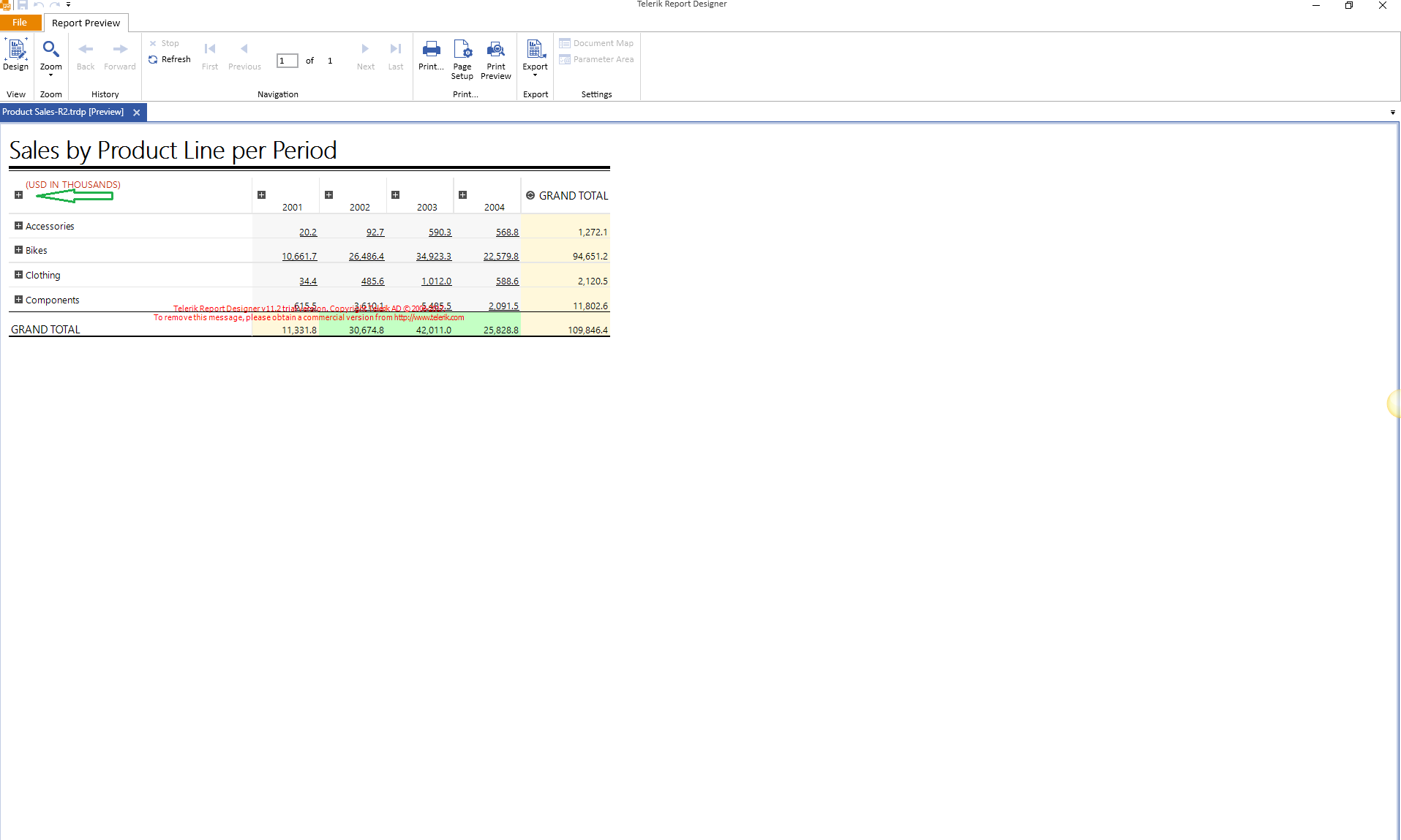 Note, that in TextBox with "(USD IN THOUSANDS)" value, a new action is included which triggers all groups to be expanded at once. That Toggle visibility action includes as targets each row group and column group.
