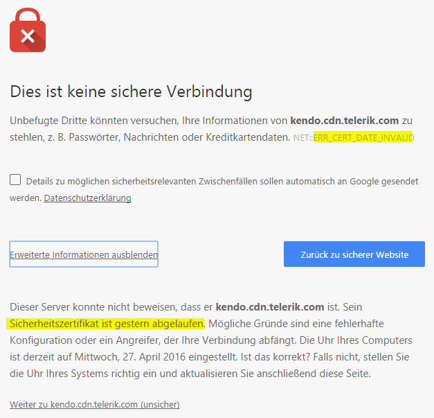As the title says, your ssl certificate seems to have expired yesterday and the report viewer isn't working anymore therefore. Example: GET https://kendo.cdn.telerik.com/2013.2.918/js/kendo.all.min.js net::ERR_INSECURE_RESPONSE