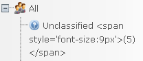 var title = String.Format("Unclassified <span style='font-size:9px'>({0})</span>", nb); RadTreeNode unclassified = new RadTreeNode(title, "-2");What is the fastest fix?