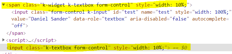 <form> <div class="form-row col-12"> <div class="form-group col-12"> <label for="Ersteller">Ersteller</label> <span class="k-widget k-textbox form-control" style=""> <input class="form-control k-input" id="test" name="test" value="Daniel Sander" data-role="textbox" aria-disabled="false" autocomplete="off" style="width: 100%;"> </span> <script>kendo.syncReady(function(){jQuery("#test").kendoTextBox({"value":"Daniel Sander"});});</script> </div> </div></form>I've realized, that my textbox is rendered in a span-element. However, in Kendo version 2020.1.219.545 this was definitely not the case. After the update to 2020.3.1021.545 a few weeks ago this "bug" happend. Today I've updated to 2020.3.1118.545 but still the same problem.