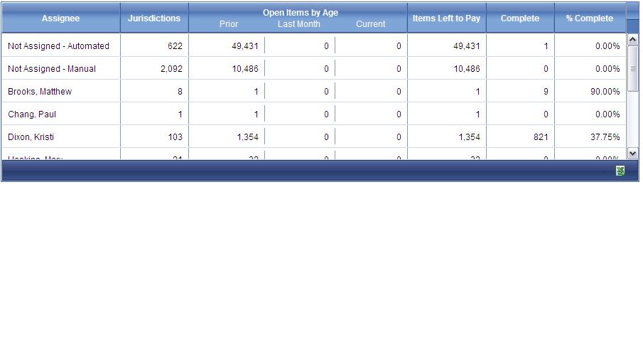 <telerik:RadGrid ID="grdCurrentandPrior" runat="server" AllowRowResize="True" AllowSorting="True" AutoGenerateColumns="False" GridLines="Horizontal" Skin="Web20" Style="margin-right: 0px" Width="897px" Height="252px" OnNeedDataSource="grdCurrentandPrior_NeedDataSource" OnExcelMLExportRowCreated="grdCurrentandPrior_ExcelMLExportRowCreated" OnSortCommand="grdCurrentandPrior_SortCommand"> <exportsettings filename="OpenItemsCurrentInventory" ignorepaging="True" openinnewwindow="True" exportonlydata="true" excel-format="ExcelML"> </exportsettings> <mastertableview commanditemdisplay="Bottom" allownaturalsort="false" usealldatafields="true"> <CommandItemSettings ShowExportToExcelButton="true" ShowAddNewRecordButton="false" ShowRefreshButton="false" /> <Columns> <telerik:GridTemplateColumn DataField="Assignee" HeaderText="Assignee" UniqueName="Assignee" SortExpression="Assignee"> <HeaderStyle Font-Bold="True" Width="150px" HorizontalAlign="Center" Font-Names="Arial" /> <ItemTemplate> <asp:Label ID="lbAssignee" runat="server" Text='<%# Eval("Assignee") %>'></asp:Label> </ItemTemplate> <FooterStyle HorizontalAlign="Right" Font-Bold="true" /> </telerik:GridTemplateColumn> <telerik:GridTemplateColumn DataField="State" HeaderText="State" UniqueName="State" SortExpression="State" Visible="false"> <HeaderStyle Font-Bold="True" Width="150px" HorizontalAlign="Center" Font-Names="Arial" /> <ItemTemplate> <asp:Label ID="lbState" runat="server" Text='<%# Eval("State") %>'></asp:Label> </ItemTemplate> <FooterStyle HorizontalAlign="Right" Font-Bold="true" /> </telerik:GridTemplateColumn> <telerik:GridTemplateColumn DataField="JurisdictionCount" HeaderText="Jurisdictions" UniqueName="JurisdictionCount" SortExpression="JurisdictionCount"> <HeaderStyle Font-Bold="True" Width="80px" HorizontalAlign="Center" Font-Names="Arial" /> <ItemTemplate> <asp:Label ID="lbJurisdiction" runat="server" Text='<%# Eval("JurisdictionCount", "{0:N0}")%>'></asp:Label> </ItemTemplate> <ItemStyle HorizontalAlign="Right" ForeColor="Black" /> <FooterStyle HorizontalAlign="Right" Font-Bold="true" /> </telerik:GridTemplateColumn> <telerik:GridTemplateColumn UniqueName="OpenItemsByAge" > <HeaderTemplate> <table id="Table1" cellspacing="0" cellpadding="0" width="100%" border="0" > <tr> <td colspan="3" align="center"> <b>Open Items by Age</b> </td> </tr> <tr> <td align="center" style="width: 33%"> <asp:LinkButton CssClass="Button" ID="btnPrioOpen" Text="Prior" CommandName='Sort' CommandArgument='OpenItemsCountPrior' runat="server" /></td> <td align="center" style="width: 33%"> <asp:LinkButton CssClass="Button" ID="btnLastMonth" Text="Last Month" CommandName='Sort' CommandArgument='OpenItemsCountLastMonth' runat="server" /></td> <td align="center" style="width: 34%"> <asp:LinkButton CssClass="Button" ID="btnCurrentOpen" Text="Current" CommandName='Sort' CommandArgument='OpenItemsCountCurrent' runat="server" /></td> </tr> </table> </HeaderTemplate> <ItemTemplate > <table id="Table2" cellspacing="0" cellpadding="0" width="100%" border="0" style="margin: 0px 0px 0px 0px;" > <tr> <td align="right" width="33%" style="border-bottom-color:White; border-left-color:White"> <%# Eval("OpenItemsCountPrior", "{0:N0}") %> </td> <td align="right" width="33%" style="border-bottom-color:White"> <%# Eval("OpenItemsCountLastMonth", "{0:N0}")%> </td> <td align="right" width="34%" style="border-bottom-color:White"> <%# Eval("OpenItemsCountCurrent", "{0:N0}") %> </td> </tr> </table> </ItemTemplate> </telerik:GridTemplateColumn> <telerik:GridTemplateColumn DataField="TotalRemainingItems" HeaderText="Items Left to Pay" UniqueName="TotalRemainingItems" SortExpression="TotalRemainingItems"> <HeaderStyle Font-Bold="True" Width="95px" HorizontalAlign="Center" Font-Names="Arial" /> <ItemTemplate> <asp:Label ID="lblTotalRemain" runat="server" Text='<%# Eval("TotalRemainingItems", "{0:N0}") %>'></asp:Label> </ItemTemplate> <ItemStyle HorizontalAlign="Right" ForeColor="Black" /> <FooterStyle HorizontalAlign="Right" Font-Bold="true" /> </telerik:GridTemplateColumn> <telerik:GridTemplateColumn DataField="CompleteCount" HeaderText="Complete" UniqueName="CompleteCount" SortExpression="CompleteCount"> <HeaderStyle Font-Bold="True" Width="80px" HorizontalAlign="Center" Font-Names="Arial" /> <ItemTemplate> <asp:Label ID="lblCompleteCount" runat="server" Text='<%# Eval("CompleteCount", "{0:N0}") %>'></asp:Label> </ItemTemplate> <ItemStyle HorizontalAlign="Right" ForeColor="Black" /> <FooterStyle HorizontalAlign="Right" Font-Bold="true" /> </telerik:GridTemplateColumn> <telerik:GridTemplateColumn DataField="PercentComplete" HeaderText="% Complete" UniqueName="clmPctComplete" SortExpression="PercentComplete"> <HeaderStyle Font-Bold="True" Width="85px" HorizontalAlign="Center" Font-Names="Arial" /> <ItemTemplate> <asp:Label ID="lblPctComplete" runat="server" Text='<%# Eval("PercentComplete", "{0:N2}%")%>'></asp:Label> </ItemTemplate> <ItemStyle HorizontalAlign="Right" ForeColor="Black" /> <FooterStyle HorizontalAlign="Right" Font-Bold="true" /> </telerik:GridTemplateColumn> </Columns> </mastertableview> <headerstyle borderstyle="Solid" /> <clientsettings> <Scrolling AllowScroll="True" UseStaticHeaders="True" /> </clientsettings> </telerik:RadGrid>
