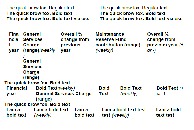 The last table has all the cells wrapped in <b> tags, but they are not rendered bold in the PDF. There seems to be some correlation to the length of the text (short text sometimes will be bold). I have also tried <strong> tags and CSS that applies bold. It does not matter which font is chosen.