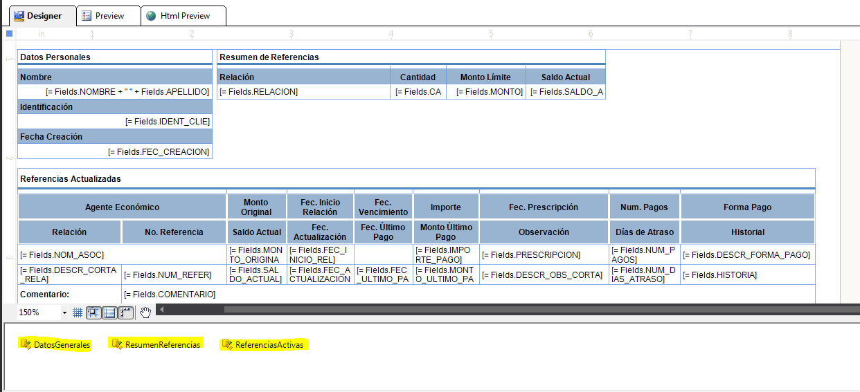 In my app i have a one dataset with three tables (DatosGenerales, ResumenReferencias, ReferenciasActivas), and the report have one dataobject by each table.