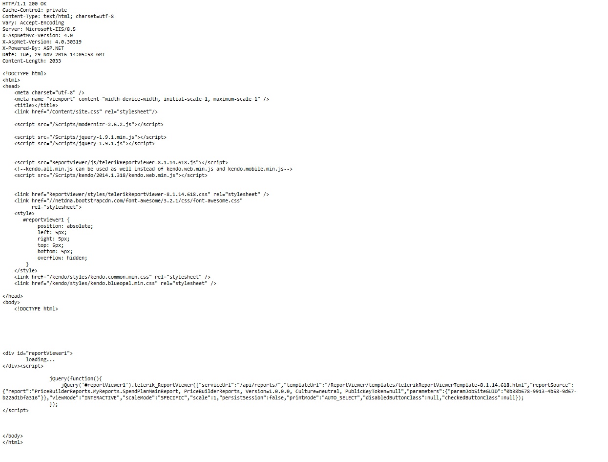 Interestingly if I hit refresh I see in Fiddler the fetches for the css and scripts and they also simply echo information that shows no errors. such as from kendo.blueopal.min.css: