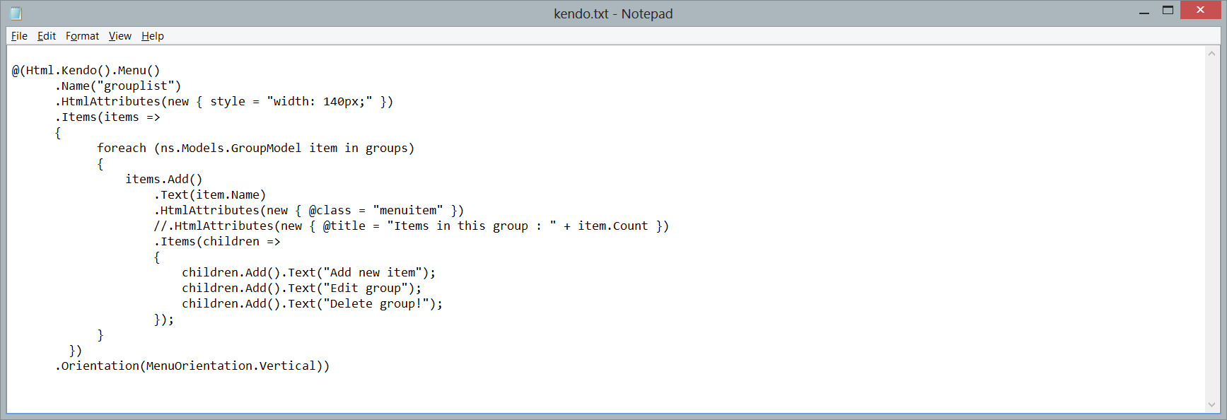 All works fine if I keep commented the second HtmlAttributes (used to set the tooltip through title), if I uncomment that line, the menu show the tooltip but, uses jquery default style (and not kendo theme) and lost item css class 'menuitem'