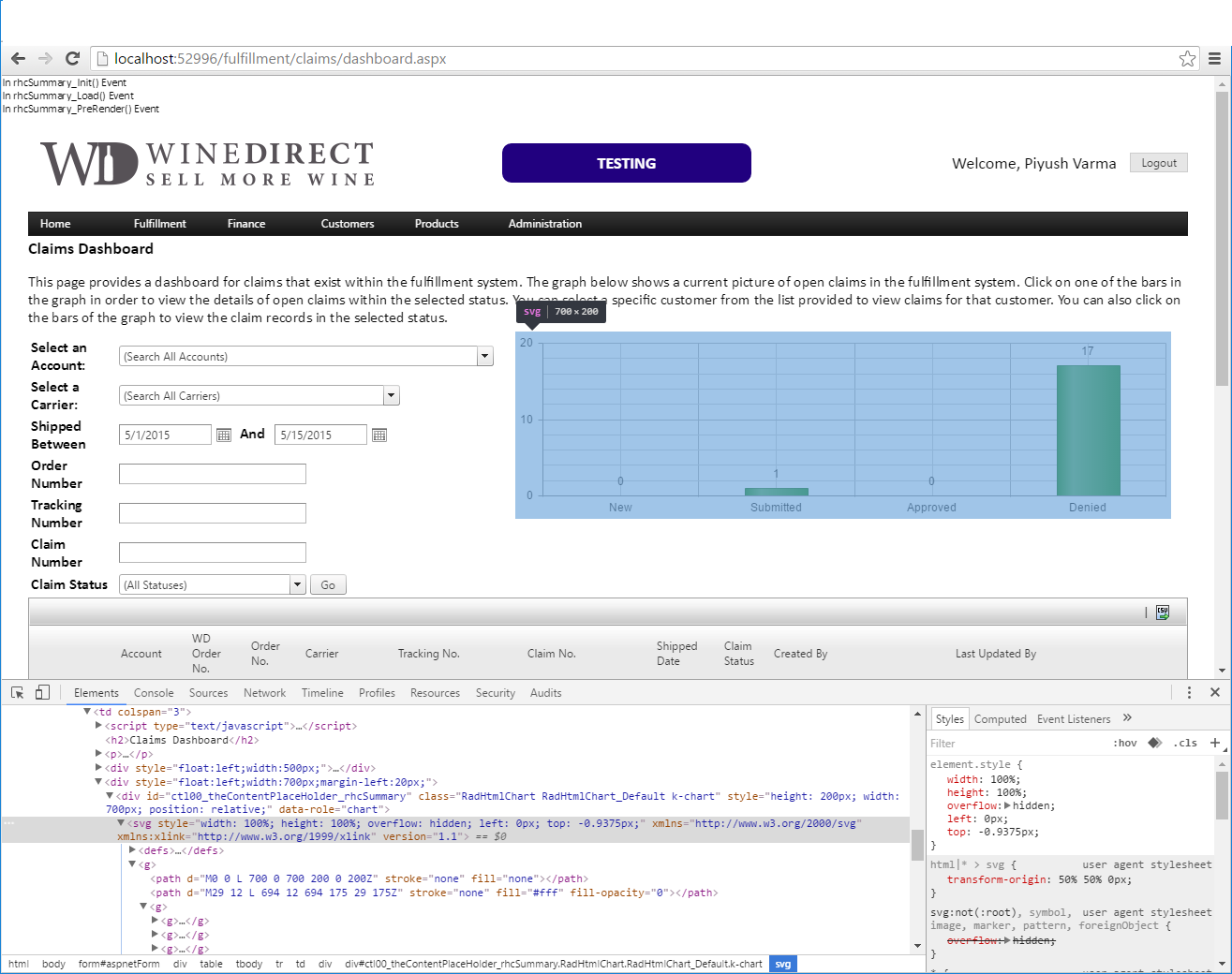 I have HtmlChart control which works from Visual Studio 2015, but not when deployed on a Web Server. When View Source, the Web Server page source does not have the svg tag. The source is below. The Telerik dll version is 2016.2.504.45, size 26,416 KB, dated 5/23/2016 11:25 AM. How can I correct the behavior on the web server please?