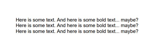 var stringToConvert = "<div><span>Here is some text. And here is some <b>bold</b> text... maybe?</span></div><div><span>Here is some text. And here is some <strong>bold</strong> text... maybe?</span></div><div><span>Here is some text. And here is some <span style=\"font-weight:bold;\">bold</span> text... maybe?</span></div>";