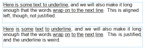 I am trying to create a report that has justified text and has portions of the text underlined. I'm using an HtmlTextBox and can set the properties to justify the text and underline portions of it. However, it displays the underline by underlining each word separately, leaving a space between the lines. Is there any way to force the underline to be one continuous line when using justified text?