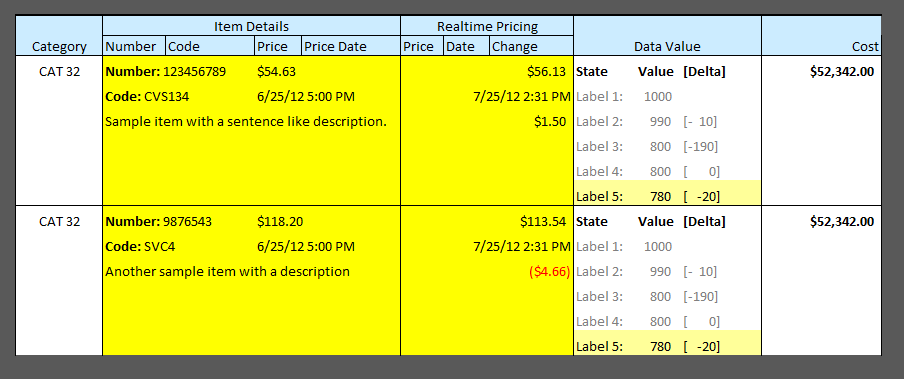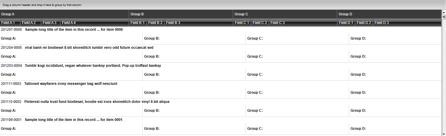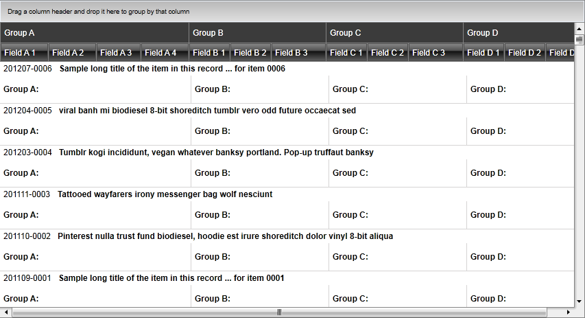 The requirement was believed to be fairly straight forward. Much as with the standard demo here, we wanted to display several pieces of data stacked vertically within a single cell of the grid. However, unlike the demo which uses a custom row layout, we want our columns to remain connected to our row layout. In other words, in that demo, imagine that the image appears aligned beneath a column header labeled Thumbnail. Then, imagine that the next three columns (the ones actually seen in the demo ... First Name, Last Name, and City ... all appeared under a group header named "Basic Details". The data which displays the first name, last name, title, and city would be aligned in a "merged" column beneath the group header of "Basic Details". So the header labels for First Name, Last Name, and City would all appear across the space allocated to the group header ... and the data contents of each row's cell would essentially be column spanned across those three actual headers. It would have an appearance similar to this example of HtmlViewDefinition here.