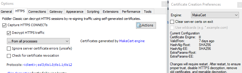 I am trying to decode https traffic with fiddler classic. I see error below in Log. I did reset all certificates, trust root cerficates with both MakeCert, CertEnroll engines. Please advice how to fix this issue. I used to decode https traffic with older version (before 2019) of fiddler which used to work without any error. Now i do not find the download link for older version of fiddler.