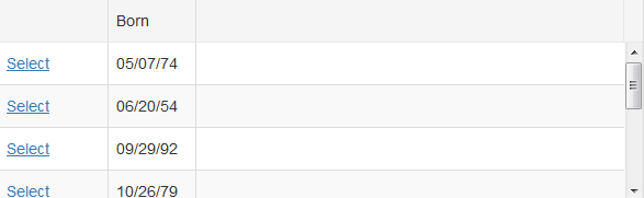 <telerik:RadGrid id="rgCEE" runat="server" AutoGenerateColumns="False" Height="100%" Width="100%" AllowPaging="False" AllowSorting="False" EnableLinqExpressions="false" ShowStatusBar="False" style="border:0px;" > <MasterTableView DataKeyNames="EmployeeId" ClientDataKeyNames="EmployeeId" Width="100%" TableLayout="Fixed" HierarchyLoadMode="Client" CommandItemDisplay="None" > <Columns> <telerik:GridHyperlinkColumn UniqueName="SelectColumn" Text="Select" DataNavigateUrlFields="EmployeeId" DataNavigateUrlFormatString="javascript:SelectExistingEmployee_CO({0});" > <HeaderStyle Width="100px" HorizontalAlign="Center" /> <ItemStyle HorizontalAlign="Center" /> </telerik:GridHyperlinkColumn> <telerik:GridDateTimeColumn HeaderText="Born" DataField="BirthDate" DataType="System.DateTime" DataFormatString="{0:MM/dd/yy}"> <HeaderStyle width="80px" HorizontalAlign="Left" ></HeaderStyle> <ItemStyle HorizontalAlign="Left" VerticalAlign="Middle"></ItemStyle> </telerik:GridDateTimeColumn> <telerik:GridTemplateColumn UniqueName="spacerCol"></telerik:GridTemplateColumn> </Columns> <CommandItemTemplate> </CommandItemTemplate> </MasterTableView> <ClientSettings AllowExpandCollapse="True" > <Selecting AllowRowSelect="False" EnableDragToSelectRows="False" /> <Scrolling AllowScroll="True" UseStaticHeaders="True" ScrollHeight="100%" /> <Resizing AllowColumnResize="False" EnableRealTimeResize="True" ResizeGridOnColumnResize="True"/> <ClientEvents OnGridCreated="rgCEECreatedHandler_CO"/> </ClientSettings> </telerik:RadGrid>