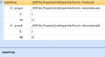 public Form1(){ InitializeComponent(); this.radPropertyGrid1.SelectedObject = new MainObject(new FirstLevel( new SecondLevelA(1,11),new SecondLevelB(2,22)));}public class MainObject{ [TypeConverter(typeof(ExpandableObjectConverter))] public FirstLevel mainProp { get; set; } public MainObject(FirstLevel mainProp) { this.mainProp = mainProp; }}public class FirstLevel{ [TypeConverter(typeof(ExpandableObjectConverter))] public SecondLevelA propA { get; set; } [TypeConverter(typeof(ExpandableObjectConverter))] public SecondLevelB propB { get; set; } public FirstLevel(SecondLevelA propA, SecondLevelB propB) { this.propA = propA; this.propB = propB; }}public class SecondLevelA{ public int A { get; set; } public int AA { get; set; } public SecondLevelA(int a, int aA) { this.A = a; this.AA = aA; }}public class SecondLevelB{ public int B { get; set; } public int BB { get; set; } public SecondLevelB(int b, int bB) { this.B = b; this.BB = bB; }}I hope this information helps. Should you have further questions, I would be glad to help.
