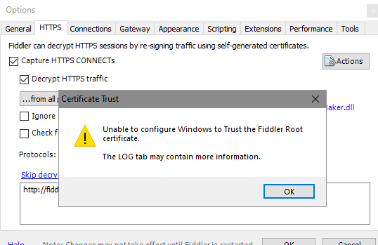 I tried a lot of solutions,none of them work. I tried to install the trust root form the store didn't work. Fiddler also blocks internet connection when I enable the HTTS decrypting. Please help.