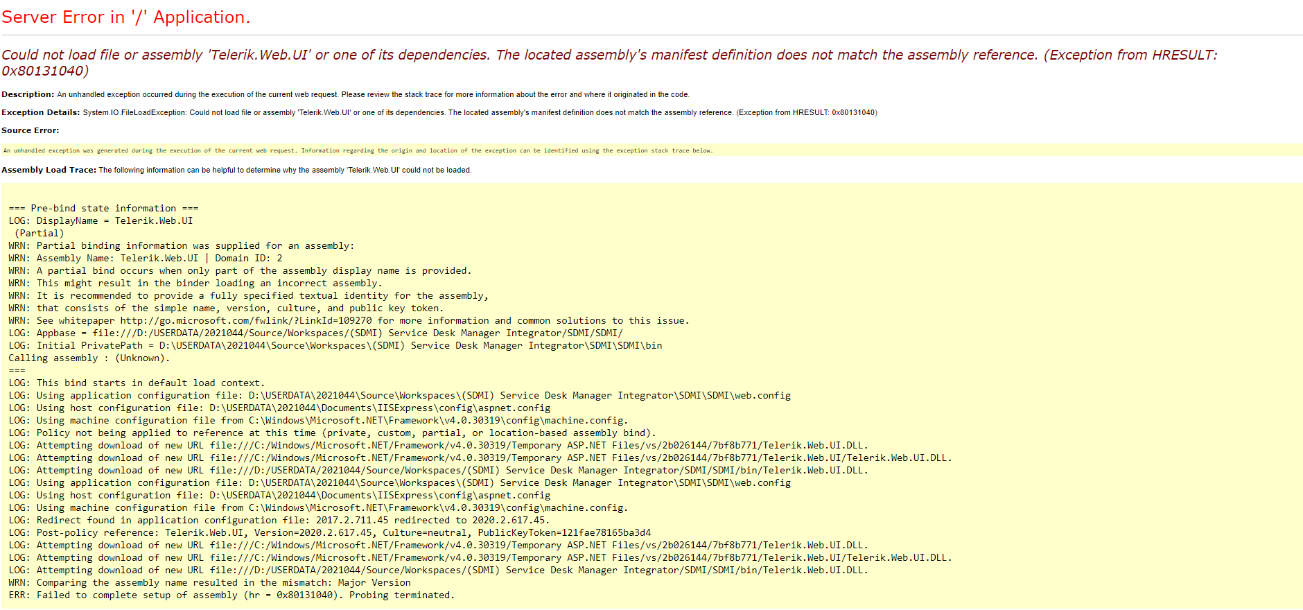 Could not load file or assembly 'Telerik.Web.UI' or one of its dependencies. The located assembly's manifest definition does not match the assembly reference. (Exception from HRESULT: 0x80131040)