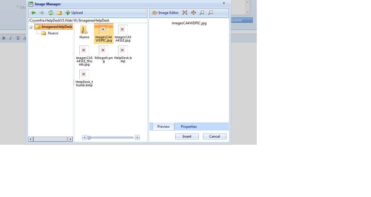 I have a problem with RadEditor Image Manager, the problem is that the preview is not working right, I don't know what is missing me to configure, as you can see in the image that I attach you, it appears a red X instead of the image, when I insert the image it seems the same, only the red X, so I'm not able to insert the image... So when I open the image in the editor, I don't have problem I can see the image.