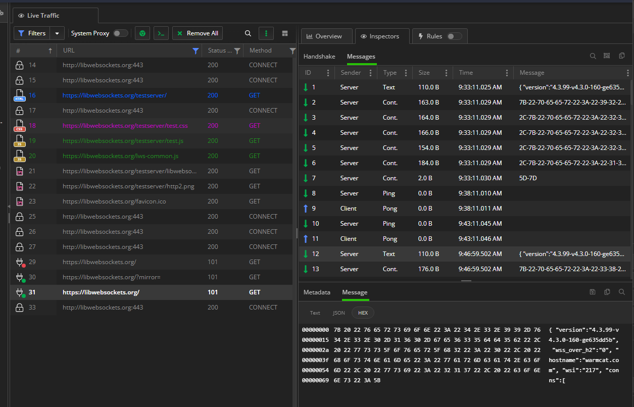 To access the WebSocket-specific UI, simply double-click on a WS session. This will open up the WebSocket inspectors, allowing you to examine the WS handshake, the list of streamed WS messages, and individual messages (by selecting them and launching the Message inspector). Here's an example: