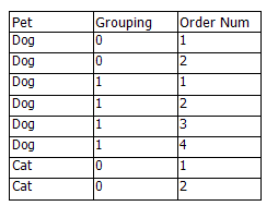 How could I put this into a table and it show only the items in each Pet/Grouping per page.